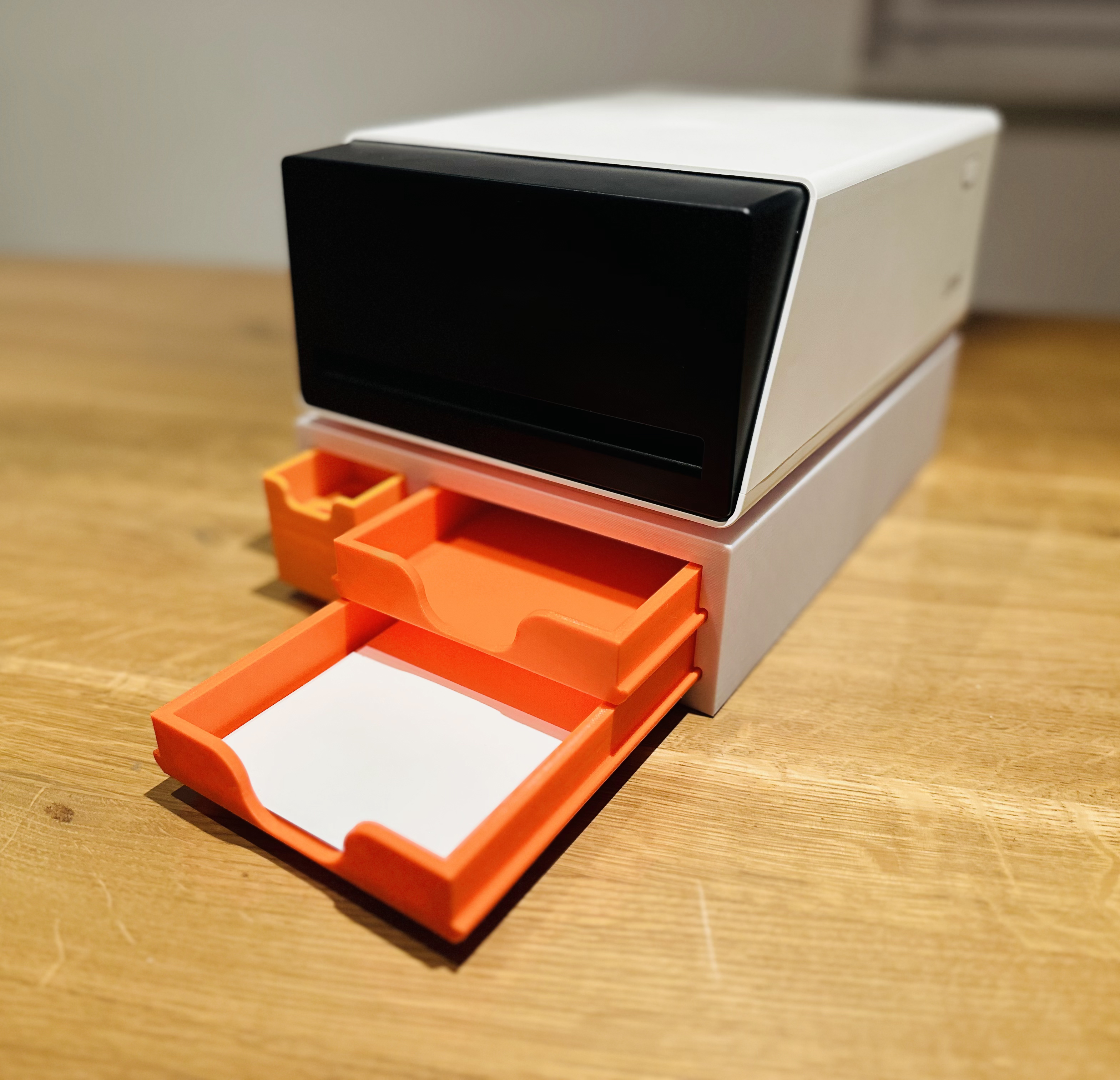 In 2 praktischen Schubladen, die sich frontal herausziehen lassen, findet dein Fotopapier und Stickerpapier einen sicheren und staubfreien Platz. Insgesamt passen bis zu 72 Blatt in den Organizer – ideal, um stets gut vorbereitet zu sein. Wer mag kann den mitgelieferten Trenner verwenden um an die richtige Papiergröße anzupassen.Mehr als nur Stauraum: